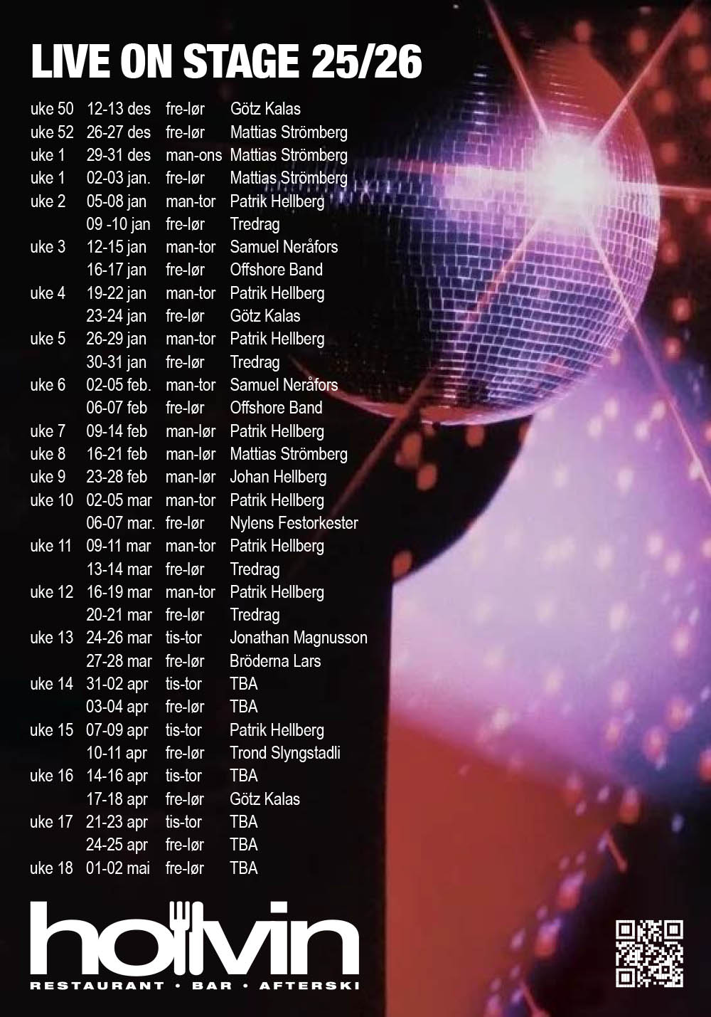 Afterskien på Hollvin er legendarisk, og kjent for sine gode band og trubadurer. Artister som TREDRAG, Nyléns Festorkester og OFFSHORE står klare hver uke på Hollvin. Sjekk ut vår bandkalender og bli med på moroa!